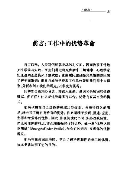 : 前言:工作中的优势革命 革命 “建立一流组织的两大前提是什么?” 两百万访谈 “盖洛普采访什么人来了解人的优势?” Ⅰ.解剖优势 第一章 辉煌人生 投资家,局长,皮肤病医生和编辑 “辉煌人生是什么?” 泰格·伍兹,比尔·盖茨和科尔·波特 “优势是什么?” 三个革命工具 “你需要什么来建立优势人生?” 第二章 发展优势 他始终那么棒吗? “科林·鲍威尔在优势上给我们什么启示?” 知识和技能 “你能改变自己哪些方面?” 才干 “你的哪些方面经久不变?” Ⅱ.发现你的优势源泉 第三章 优势识别器 才干的蛛丝马迹 “如何识别自身才干?” 优势识别器测试 “它的工作原理是什么;你如何完成测试?” 第四章 优势识别器的34个主题 成就 行动 适应 分析 统筹 信仰 统率 沟通 竞争 关联 回顾 审慎 伯乐 纪律 体谅 公平 专注 前瞻 和谐 理念 包容 个别 搜集 思维 学习 完美 积极 交往 责任 排难 自信 追求 战略 取悦 Ⅲ.发挥优势 第五章 你在问的问题 第六章 管理优势 第七章 建立优势组织 附录