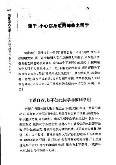 : 第一编 乱世发家的成功术 ——闲看《三国演义》 蒋干:小心你身边的那些老同学 毛遂自荐,却不知此同学非彼同学也 外强中干,无力应对老同学的咄咄逼人 自作聪明,谁知中了老同学的反间计 自投罗网,又一次落入老同学的圈套 杨修:藏显有度,方为书生的参政之道 才思敏捷,片刻之间猜透人家心思 处处显援,屡犯曹操之忌, 批判一切,大大小小愤青的始祖 恃才傲物,注定了没有好下场 周瑜:争第一,真的有这么好吗? 临危不惧,视百万军队为纸老虎 运筹帷幄,谈笑间强虏灰飞烟灭 器量狭小,容不得别人比自己高明 机关算尽,青年才俊活活被气死 陆逊:我们的一生到底需要几次成功? 韬光养晦,默守最佳出头机会 智取荆州,为孙权除去心头之痛 彝陵大捷,彻底击溃汉蜀元气 两次成功,不愧东吴第一号功臣 诸葛亮:知其不可而为之的悲剧英雄 欲擒故纵,拼命提高自己的身价 演好处女秀,树立在军中的威信 外交博弈,联吴抗曹实现三分天下 事必躬亲,不善于任用与培养人才 穷兵黩武,知其不可而为之 曹操:“国有资产”私人化第二人 头脑灵活,迅速从一面看到另一面 豪迈大气,赢得起更输得起 既厚又黑,收买人心铲除危害 招贤纳士,人才队伍建设十分合理 重实虚名,“国有资产”私人化第二人 刘备:空手套白狼的三大杀手锏 树立品牌,大胆打出汉室宗亲旗号 求贤若渴,以谦卑的态度延揽人才 作秀高手,三国中第一号演戏天才 不善藏拙,结果弄得晚节不保 司马懿:凭什么成为三国最大的赢家? 韬光养晦,在曹操手下拼命地装孙子 投效曹丕,从后台风光地走向前台 用兵如神,通过军事行动夺得兵权 步步紧逼,曹氏政权落入司马氏之手 三国归晋。将最后一步留给自己的子孙 第二编 梁山规则与江湖世界 ——闲看《水浒传》 王伦:当未来的手下比你更贤能怎么办? 屡试屡败,落第秀才水浒占山为王 妒贤嫉能,拒绝超过自己的豪杰入伙 机关算尽,百般为难走投无路的林冲 顽固不化,最终跌死在同一块石头上 鲁智深:水浒中最大的精明人, 救助金氏,三拳打死镇关西 再次护花,智降小霸王周通 有谋有划,大闹野猪林救林冲 鲁与女人,一个复杂而难解的谜 林冲:忍辱负重的本色英雄, 忍辱负重,在最有利的时机出手 定好坐标,不妄自僭越领导之位 重情重义,爱她就要不牵绊她 李师师:史上最成功的名妓 多才多艺,拼命增加魅力指数 自知者明,从不僭越自己的身份 惺惺相惜.;赢得重情重义的好名声 燕青:天下第一“公关”先生 风斜雨急处,立得脚定 花浓柳艳处,着得眼高 路危径险处,回得头早 公孙胜:唯一主动放弃攻打方腊的明白人 身怀绝技,让自己成为不可替代之人 心胸豁达,不为世俗之物所束缚 两次出逃,只因看透了身边的形势 吴用:到底是有用还是无用? 得罪朝廷,被迫逃上梁山, 见风使舵,始终站对队伍 眼光短浅,搞阴谋捉襟见肘 毫无阳谋,梁山毁灭的大罪人 宋江:生财有道的江湖老大 疏财仗义,在江湖上树立威望 利用流通,花别人钱赚自己名 区别对待,将钢用在刀刃上 擅长演戏,厉害的厚黑学专家 改组梁山,洗底漂白反政府武装 第三编 看透了人生更痛苦 ——闲看《红楼梦》 袭人与晴雯:从底层奋斗成功的正反面教材 主动出击,取得主子的信任 宽容忍让,尊重大观园里的那些老人 与人为善,不让身边的“同事”难堪 忍辱负重,越熟越不能任性胡来 贾探春:一个末世女改革家的悲哀 两派相争,来之不易的掌权机会 铁面无私,珍惜荣国府每一分钱 百日维新,昙花一现的悲剧式改革 林黛玉PK薛宝钗:你会选择哪一个? 贤惠能干,宝钗会是个好妻子 少年老成,宝钗并非真爱对方 为爱执著,黛玉死都不会后悔 王熙凤:这样的女强人你会不会娶? 雷厉风行,贾府优秀的管理人才 曲意逢迎,善于巴结老祖宗 心狠手辣,毒设相思局害死贾瑞 口蜜腹剑,毫不留情除掉第三者 水满则溢,聪明反被聪明误 贾母:贾府老年人政治的悲哀 放烟雾弹,老废物其实是权力最大的人 疑神疑鬼,靠骗局来维持自己的尊严 不愿放权,压制了贾府年轻一代的成长 纵容宝玉,违背宝玉意志乱点鸳鸯谱 贾宝玉:爱,让一个人沧海桑田 都道多情,可谁知这也是一种逃避? 红颜薄命,谁又能主宰自己的命运? 弱水三千,吾只取一瓢饮 爱而不能,这个世界还能相信谁? 第四编 有用就是人才,没用就是蠢才 ——闲看《西游记》 沙和尚:如何把一变成 以和为贵,两害相权取其轻 善解人意,揣摩透别人的心思 和而不同,谨遵君子为人之道 裁谁,也不能裁沙和尚 女人都爱猪八戒 好吃好色,生活中一头本色童真的猪 活跃开朗,工作上一头不可或缺的猪 安全体贴,感情上一头女人都爱的猪 齐天大圣孙悟空的成功之道 三闹天庭,最终被压在五指山下 及时省悟,依靠事业走向辉煌 包容他人,充分依靠团队的力量 调动资源,敢于麻烦别人 唐僧:做领导的懂得越少越好 志存高远,始终生活在未来 无欲则刚,不为糖衣炮弹击倒 容人之长,具有宽阔的胸襟 驾驭有术,权力在牵制中得到平衡 观音菩萨:佛界第一相才高手 主动请缨,深入基层寻找取经人 容人之过,学会扬长避短地用人 各取所长,组建互补的取经团队 恩威并重,最为杰出的管理者