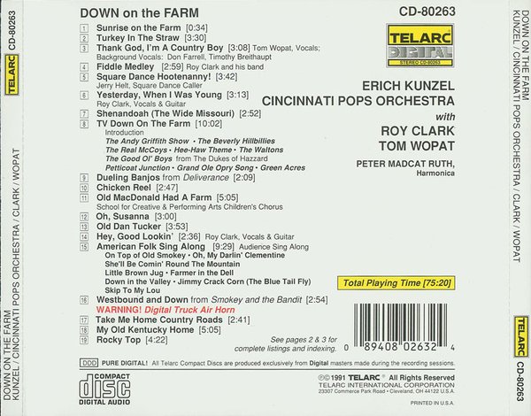 除此之外,既然名为「欢乐农庄」,Telarc当然不会忘记把特殊音效加进去,於是唱片一开始你听到的不是音乐,是许多动物的叫声,包括鸡啼、牛哞、马嘶、狗叫,所有农庄动物叫声在这里都可以听见;在「Old MacDonald Had A Farm」中动物与儿童合唱团齐唱,听后令人捧腹。这是张充满欢乐的唱片,相信很少人在听完之后还能端坐在椅子上的。