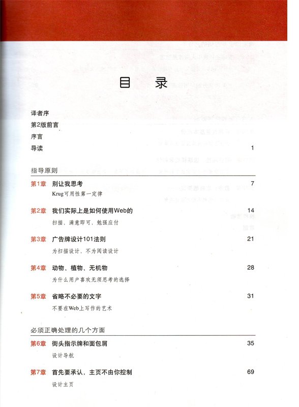 : 译者序 第2版前言 序言 导读 1 指导原则 第1章 别让我思考 7 Krug可用性第一定律 第2章 我们实际上是如何使用Web的 14 扫描,满意即可,勉强应付 第3章 广告牌设计101法则 21 为扫描设计,不为阅读设计 第4章 动物、植物、无机物 28 为什么用户喜欢无须思考的选择 第5章 省略不必要的文字 31 不要在Web上写作的艺术 必须正确处理的几个方面 第6章 街头指示牌和面包屑 35 设计导航