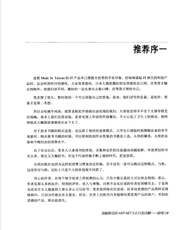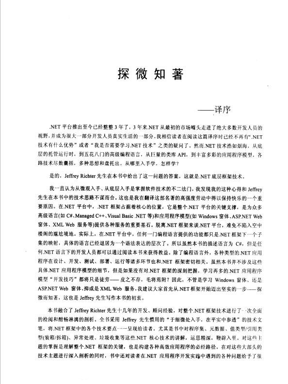 新手推荐以下书籍: 1.Programming ASP.NET 中文版(第3版) 本书主要介绍.NET平台和ASP.NET;HTML编程基础;比较ASP和ASP.NET;ASP.NET中的事件;比较HTML控件和ASP控件;基本的ASP控件APl;代码隐藏窗体:使用Visual Studio.NET集成开发环境:跟踪,调试和错误处理;ASP.NET中的验证控件;数据绑定技术基础;列表控件和DataGrid控件;ADO.NET指南;调用存储过程;更新数据库记录;Repeater和DataList控件;自定义ASP.NET控件;Web服务概观;创建和消费一个用于证券报价机的Web服务示例;解释ASP.NET缓存技术;ASP.NET中用于验证、授权和模拟的安全选项;ASP.NET中的配置和部署选项:一个数据库设计快速指南的附录。. 本书对于ASP.NET 2.0技术和Visual Studio 2005进行了全面讲解,出色地囊括了读者在实际编程中会用到的ASP.NET的重要特性,十分适合中级读者。.. 自 2001年问世以来,Microsoft Visual Studio 和 ASP.NET已经成为构建基于Windows的web应用程序和服务的最受欢迎的开发工具。数千名开发人员已经通过这本权威的书籍掌握了这些工具。如今,在这本经过重新修订和扩充的新版本中,作者Jesse Liberty 和 Dan Hurwitz向你展示了如何使用Visual Studio 2005、C# 2.0和 ASP.NET 2.0构建下一代的web应用程序。你很快就可以在更短的时间内以更少的代码构建更为安全、交互性更强的站点,其效果甚至会超出你的想象。 《Programming ASP.NET》首先简要介绍了ASP.NET 2.0 和 Visual Studio 2005,这样可以很快地提高你的工作效率。本书前面的章节深入介绍了控件、事件、ASP.NET web页的生命周期以及其他一些使用ASP.NET框架的基本概念。... 2.Programming C# 中文版(第4版) 本书是经典C#语言书Programming C#的最新版第4版。著名作者Jesse Liberty为有经验的Ⅱ从业人员快速掌握并运用这种新型语言提供了所需要的信息。本书从c#的关键字和基本概念开始介绍,并告诉你如何结合三个核心的应用程序平台——ASP.NET.NET Windows窗体和ADO.NET-来应用C#语言创建典型的桌面和网络应用程序,你将会学到如何运用.NET平台的丰富功能来开发应用。本书中的所有文字和例子都已经更新为与Visual Studio 2005.NET框架2.0以及C#2.0相适应。本书适合.NET平台开发应用程序的程序员。 3.你必须知道的.NET 本书来自于微软MVP的最新技术心得和感悟,将技术问题以生动易懂的语言展开,层层深入,以例说理。全书主要包括了.NET基础知识及其深度分析,以.NET Framework和CLR研究为核心展开.NET本质论述,涵盖了.NET基本知识几乎所有的重点内容。全书分为5个部分,第1部分讲述.NET与面向对象,从底层实现角度分析了.NET如何实现面向对象机制,进一步分析了面向对象设计原则;第2部分论述了.NET类型系统和CLR的内存管理机制,并对 IL语言进行了相应介绍;第3部分论述.NET Framework框架的方方面面,详细分析了.NET框架的所有重点、难点和疑点内容,对框架类库的全貌进行了必要的专题性探讨;第4部分重点介绍了.NET泛型和安全性的相关知识和本质解密;第5部分对.NET 3.0/3.5新特性进行了详细的介绍和引导,对于快速入门.NET新特性提供了方便之门。   本书适于对.NET有一定了解的技术学习者、软件工程师和系统架构师阅读,同时也有助于.NET初学者进行快速提高,可作为大中专院校和.NET技术培训机构的参考教材。 付上30本书的封面介绍: