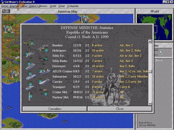 在建立了军事部队后,可用方向键控制此部队的移动,或用命令选单中的选项来下达特殊的命令,使军事部队去探索未知的区域,向外扩张,攻击敌人,保护文明的发展。一些部队的兵种要在一定的科技出现后才会出现。部队的属性有移动力(包括飞行距离,非空中部队为0)、兵种(如地面部队、空中部队和海上部队)、攻击力、防御力、生命力、火力 (即每次击中敌人所造成的伤害)、花费(通常x10为所需原料)、承载量、可载运的部队数、人工智能等。