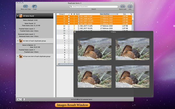 One of the most interesting features of DupeZap is the capability to separate automatically, for quick and easy removal, found items via "Smart Baskets."