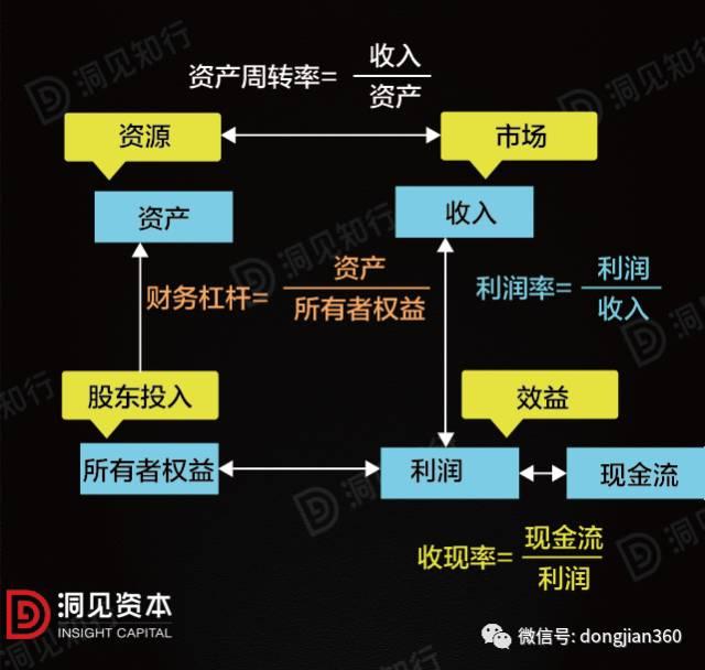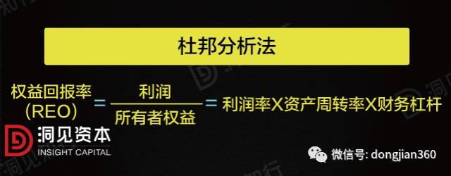 但是对于我们所有者来说,最重要的是考虑我投了这100万进来,我到底赚了多少钱。也就是说,投资者最关心的是权益回报率又叫做ROE,就是下面的这个公式:权益回报率=利润÷所有者权益。经过一系列指标的换算之后,权益回报率=利润率×资产周转率×财务杠杆。这套方法非常有名,所有做财务分析的人都知道这套方法,叫做杜邦分析法。