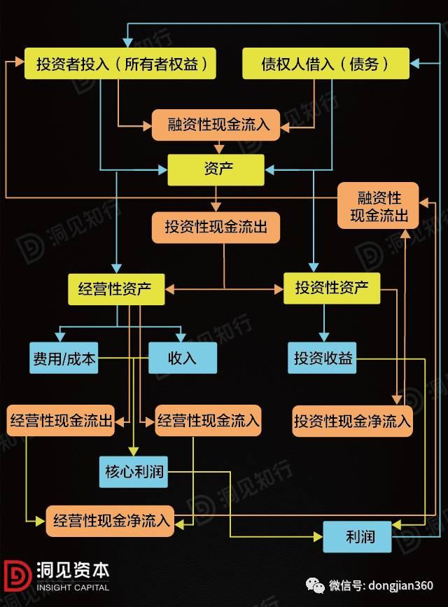 有了蓝色部分资产负债表和紫色部分的利润表之后,还有一个特别重要的是“现金流量表”,就是上述图里的棕色部分。