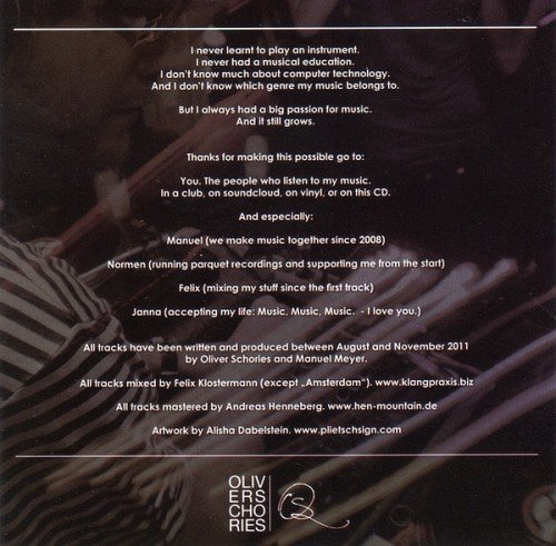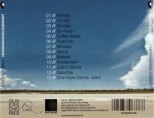 2011年【Outtake】和【Tremodo 】这两曲的出现,便多少勾起了人们对Oliver Schories后续作品的期待。 2012年[Herzensangelegenheit]专辑的推出,也带来期待中的审视。 Techno清晰而淡淡的口感,少许人声的点缀,沉淀的旋律映衬出少许的空灵,少许的迷幻。 而这些也正如很多人预料中的一样,确实惊喜。