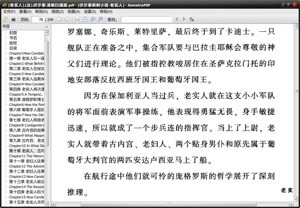 : 第一章 老实人在一座华丽的城堡里被抚养成人后来被驱逐出去 第二章 老实人在保加利亚的遭遇 第三章 老实人逃离保加利亚及随后的遭遇 第四章 老实人再次遇到庞格罗斯先生及其遭遇 第五章 庞格罗斯博士、老实人、再浸礼教徒雅克遭遇暴风雨、海难、地震等灾难 第六章 葡萄牙人是如何举办庄重的火刑典礼以阻止未来地震的发生,老实人如何被当众鞭打 第七章 老妇人照顾老实人老实人遇上他的所爱 第八章 古内宫的故事 第九章 古内宫、老实人、大判官和犹太人之间的事 第十章 老实人、古内宫和老妇人到达卡迪士后的遭遇,他们又如何上船 第十一章 老妇人往事 第十二章 老妇人往事(续) 第十三章 老实人被迫离开美丽的古内宫小姐和老妇人 第十四章 老实人和卡坎波在巴拉圭受到耶稣会士接待 第十五章 老实人杀死他亲爱的古内宫小姐的哥哥 ……