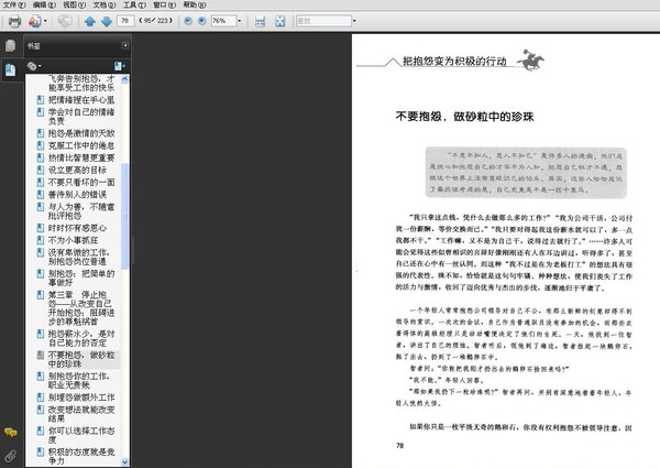 : 自测自评1 工作满意度自我测试 自测自评2 职业优劣感自我测试 自测自评3 你敬业吗 第一章 不要抱怨——抱怨会让你失去更多 第二章 扫除抱怨——让积极情绪飞奔 第三章 停止抱怨——从改变自己开始 第四章 拒绝抱怨——方法总比困难多 第五章 远离抱怨——少说多徽多行动 第六章 不找借口——责任面前无怨言 参考文献