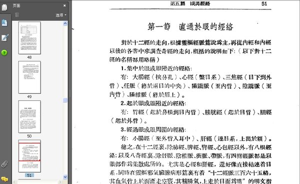 经络著作。日本·长滨善夫、丸山昌朗编,承淡安译。作者根据其在临床上发现的一位眼科病人,在针刺各经络的原穴时,所表现的感传现象基本上与十二经脉的走行一致,而得出了经络确实存在的结论。本书即其总结的考察报告,书中附有若干图表。1955年由千顷堂书局出版。