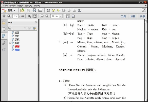 《德语语音》分语音和基础教程两个阶段,语音教程六课,基础教程十五课,包括音素和语调两方面的内容。音素方面,在语音阶段除了音素练习外还增加了音素的发音要点,并附有图解和发音规则,系统地介绍了德语语音知识。在基础阶段,针对中国学生发音上的困难及常见错误编写了练习材料;语调方面,从语音阶段第一课开始,便进行系统的训练,每课有详细的规则和练习,除此之外,对语音阶段的全部课文及基础阶段一至八课的课文加注了语调曲线或语调箭头、句重音符号以及停顿标志,便于学生对照朗读,使其准确地掌握语调。