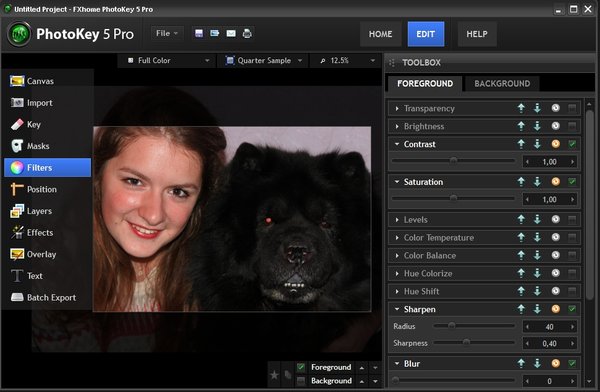 FX-Home PhotoKey的功能主要是将图像前景背景融合,将你的多张图像按照前景和背景自动合并在一起,并且能达到很自然的效果,尤其适合背景色为蓝色或者绿色的图像。比如你想将一张个人单身照,融合合并进另一张风景照中,使用FX-Home PhotoKey可以达到事半功倍的效果!