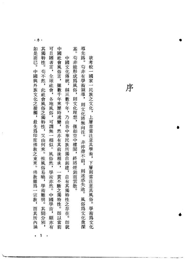 序   欲考较-国家-民族之文化,上层首当注意其「学术」,下层则当注意其「风俗」。学术为文化导先路。苟非有学术领导,则文化将无向往。非停滞不前,则迷惑失途。风俗为文化奠深基。苟非能形成为风俗,则文化理想,仅如空中楼阁,终将烟销而云散。   中国文化传统,绵亘数千年,乃由吾中华民族所独自创建,自有其独特性之存在。印就中国社会风俗言,虽数千年来历时递变,然亦有其前后相承,一贯不断之独特性。郎以当前可目睹者言,全球社会,各地风俗,可谓无一相似。风俗然,学术亦然。中国学术,显亦有其独特性。苟不然,此社会风俗之独特性,又由何来。惟风俗易晓,学术难明。其间分别,如是而已。中国与外族文化之接触,最先为印度佛教之东来。佛教虽为二不教,而其所内涵之学术意义亦特丰。佛教之中国化,则胥由中国学术传统中所赋有之独特性之功。南北朝、隋、唐高僧,多兼通内外学,遂使中国学术逐渐渗入于佛教信仰中,而佛教之在中国,乃亦随之而变。