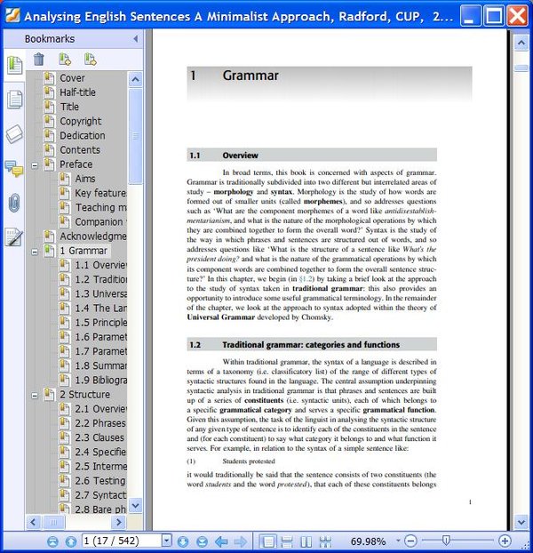 : Preface page xi Acknowl edgment s xiv 1 Gramm ar 1 1.1 Overview 1 1.2 Traditiona l gramm ar: categor ies and functi ons 1 1.3 Universal Gr ammar 11 1.4 The Languag e Facul ty 15 1.5 Princip les of Univer sal Gramma r 19 1.6 Parameter s 21 1.7 Parameter setting 26 1.8 Summar y 30 1.9 Bibliographi cal backgrou nd 31 Workboo k sectio n 33 2 Struct ure 39 2.1 Overview 39 2.2 Phrases 39 2.3 Clauses 43 2.4 Specifiers 49 2.5 Intermedi ate and max imal projectio ns 53 2.6 Testing structure 58 2.7 Syntactic relations 69 2.8 Bare phras e struct ure 75 2.9 Summar y 77 2.10 Bibliographi cal backgrou nd 80 Workboo k sectio n 81 3 Null constitu ents 92 3.1 Overview 92 3.2 Null subj ects 92 3.3 Null auxi liaries 97 3.4 Null T in indicat ive clauses 101 3.5 Null T in subj unctive cla uses 107 3.6 Null T in inf initive cla uses 109