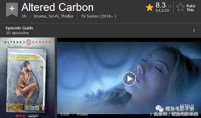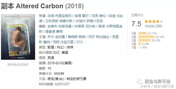 副本/碳变 Altered Carbon (2018) 《副本/碳变 》是网飞(Netflix)2018年新剧,浓厚的赛博朋克风格,光怪陆离的未来世界。目前第一季季终。 改编自理查德·K·摩根所著的经典赛博朋克风格黑色小说,以 300 多年后的未来为背景,讲述了一个集合谋杀、爱、性和背叛的精彩故事。彼时社会已被一种新技术改变:意识可被数字化、人的身体可以互换、死亡不再是永恒的。