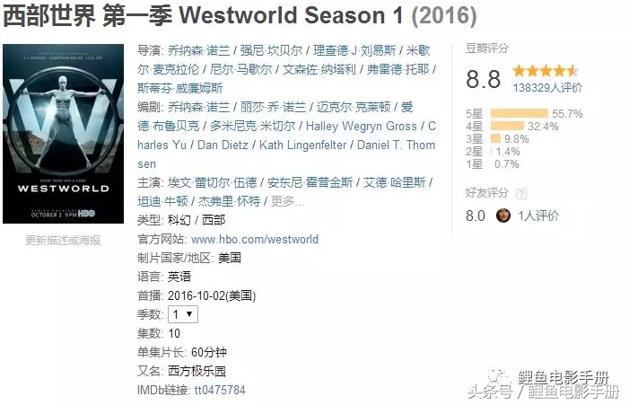 西部世界 第一季 Westworld Season 1 (2016)第一季季终,第二季2018年播出。 《西部世界》是HBO翻拍1973年同名电影的科幻剧集。故事设定在未来世界,在一个庞大的高科技成人主题乐园中,有着拟真人的机器“接待员”能让游客享尽情欲、暴力等欲望的放纵,主要叙述被称为“西部世界”的未来主题公园。它提供给游客杀戮与性欲的满足。 人类本来在西部世界就是上帝,可以为所欲为的支配一切,当然先决条件你得有钱。可惜好景不长,被侮辱被压迫的机器人渐渐觉醒有了自我意识,西部世界将彻底天翻地覆改天换地。 H(黄)B(暴)O(台)这三个字母在很多剧迷心中就是神一样的存在,不过这几年新秀网飞势头也挺猛的,对于观众来说是好事,谁不想多看点好剧呢,至于哪家拍无所谓吧。