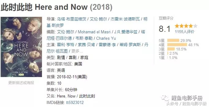 此时此地 Here and Now (2018)第一季连载中 HBO出品,由荣获奥斯卡奖与艾美奖双重肯定的知名编剧、导演艾伦·鲍尔创作的剧情类影集。 剧集围绕着一个现代的多元种族的家庭:哲学教授、其执着的妻子和三个分别从利比里亚、越南及哥伦比亚领养的小孩以及他们唯一亲生的孩子,所面临的一连串生命的转折与情感上的挑战。 HBO果然名不虚传,一套家庭情感剧也能搞得这么惊世骇俗。这个家庭太复杂了,头两集鲤鱼基本就是在理清家庭成员的具体关系。本来是This Is Us的预期,结果只能说远远超出预期。