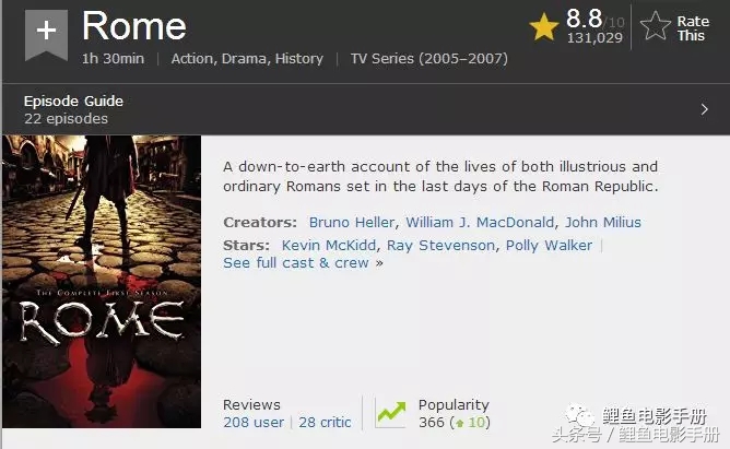 罗马 1-2季全剧终 《罗马》(Rome)是美国HBO电视网出品、英国、意大利及美国合作拍摄的历史题材电视剧。该剧描述了古罗马从共和国走向帝国的历史,两位主人公卢修斯·沃伦诺斯和提图斯·普洛虽然只是普通古罗马士兵,但他们却不知不觉间参与甚至影响了不少重大历史事件。 罗马帝国三巨头和埃及艳后群星璀璨的辉煌时代,作为一部架空历史的剧集,这部制作的非常出色,鲤鱼大爱这部。
