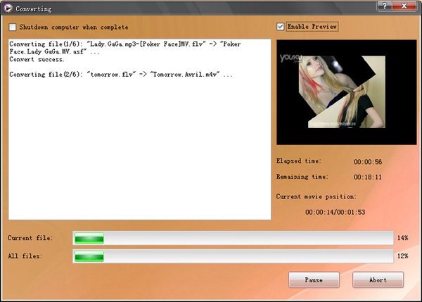 Converts almost all popular video formats including AVI, ASF, MOV, RM, RMVB, FLV, MKV, MPG, 3GP, M4V, VOB, YouTube videos for iPhone, iPod, PSP or other portable video devices. It also supports any user defined video file formats as the output.