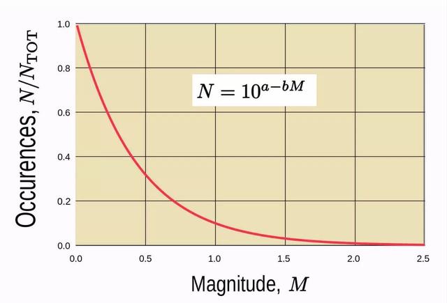 古騰堡-芮克特定律:N表示震级≥M的地震数量;a与b为常数。图源:维基共享资源