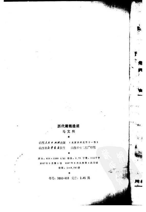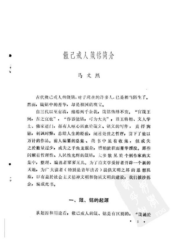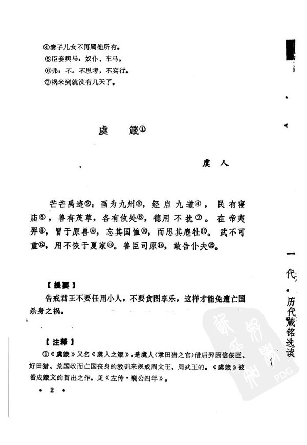 本书分箴、铭两部分,选录了上古至清九十余位名人的箴言或铭言280余条。“戒书”的作用是“托于物以自警戒”,和儆戒箴铭相似,故酌收数则,分列于有关箴铭中。