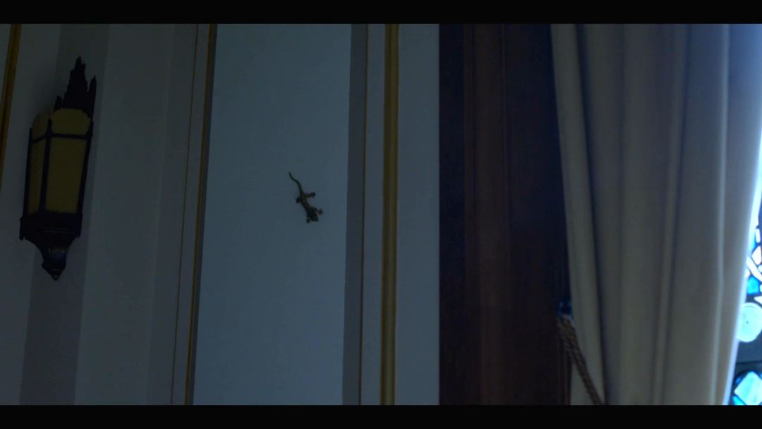 注意到背后墙上的壁虎了吗?这只壁虎在他看望父亲遗体的停尸间中出现过。