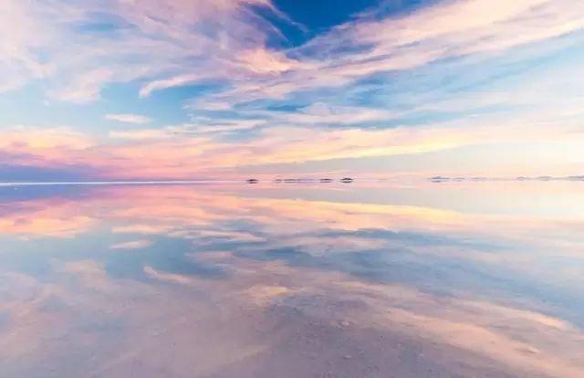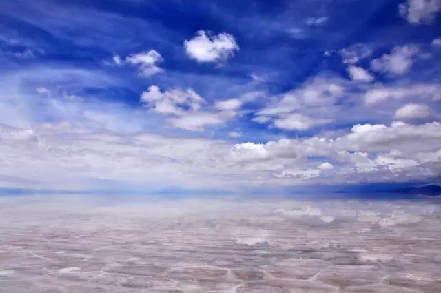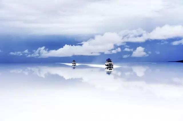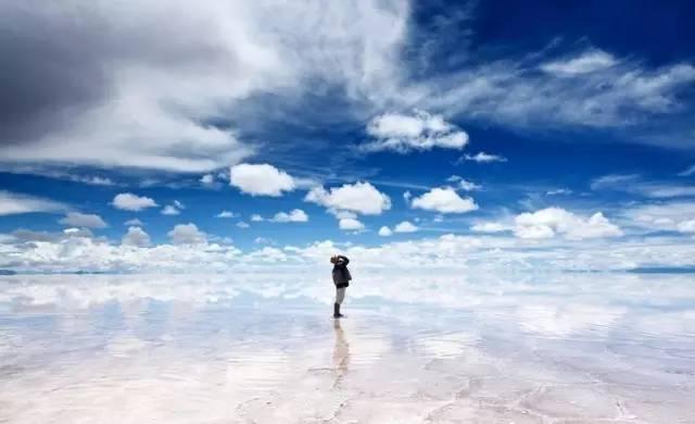 在下雨后硬壳般的盐湖上有薄薄的水,光滑的镜面反射着令人窒息的天空景色,美称“天空之镜”。