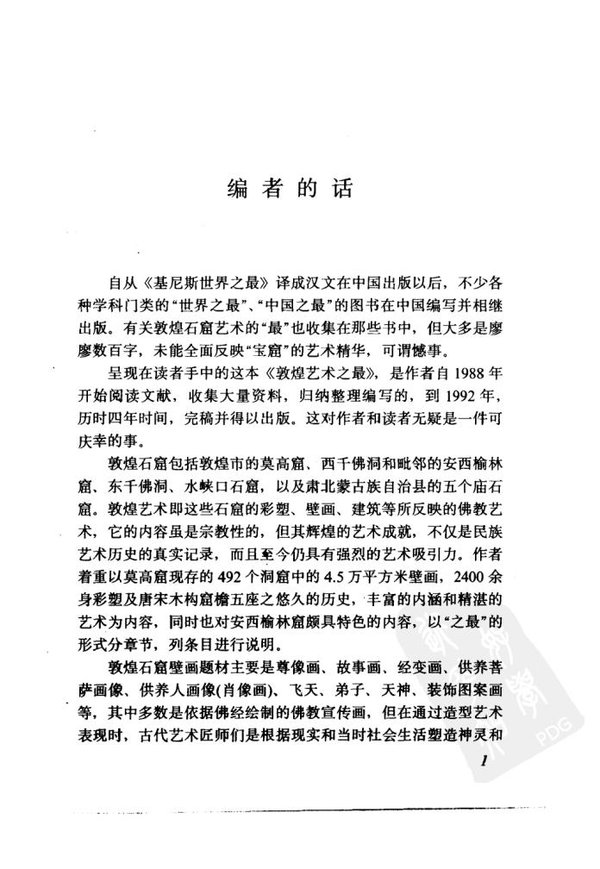 敦煌石窟包括莫高窟、西千佛洞、水峡口石窟,以及肃北蒙古旅自治县的五个庙石窟。敦煌石窟艺术即指建筑艺术、壁画、图案艺术、彩塑艺术、书法 (写经)艺术、敦煌绢画、教煌舞乐和敦煌染织、刺绣等工艺关术,该书仅介绍其中的建筑艺术、彩塑艺术以及壁画和图案艺术3部分·共计250余条,图版250余幅,重点介绍壁画艺术,分为尊像画、故事画、变经画、供养人画像、图案画五类。全书收集了这三方面的相对比较最早与最晚、最大与最小、最高与最矮、最多与最少……等记录,编集了中外敦煌学专家的研究成果,内容丰富,生动活泼,集知识性、学术性、鉴赏性、辞书性、资料性为一体,图文结合,以文释图,雅俗共赏。