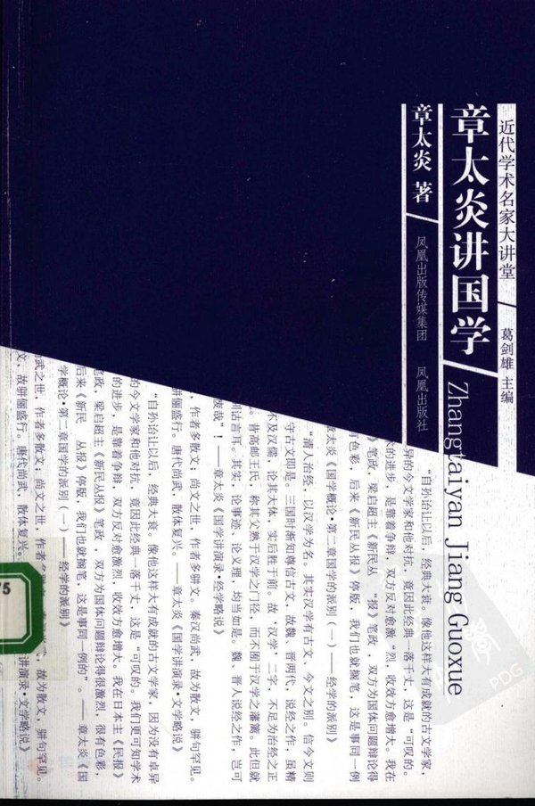 凤凰出版社推出由著名学者葛剑雄主编的《近代学术名家大讲堂》丛书。第一辑八种:《傅斯年讲史学》、《王国维考古学文辑》、《梁启超讲国学》、《刘师培讲经学》、《朱自清讲诗》、《闻一多讲文学》、《吕思勉讲思想史》、《姚永朴文史讲义》。第二辑收录《章太炎讲国学》、《杨树达讲文字学》、《余嘉锡讲文献学》、《浦江清文史讲义》、《姚名达讲目录学》、《柳诒徵讲版本学》、《姚永概讲文学》、《吴梅讲词曲》等。