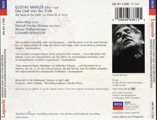 这是马勒取材自中国诗集,附歌唱的交响作品,因其正处于生命极度困厄的末期,对尘世的不舍眷恋及对自然的向往而成就的伟大作品。伯恩斯坦这套(大地之歌)录制于1966年,一反男高音与女中音的固定编制,而以男中音费雪狄斯考担任女中音部分。伯恩斯坦的演诠具无比感染力,加上费雪狄斯考与男高音詹姆士金的精采演唱,使本版成为与华尔特、克伦培勒两位大师名盘鼎足而立的三大名盘。本就已鲜活无比的录音,如今再加上出色的24bit转录,自然更具收藏价值。
