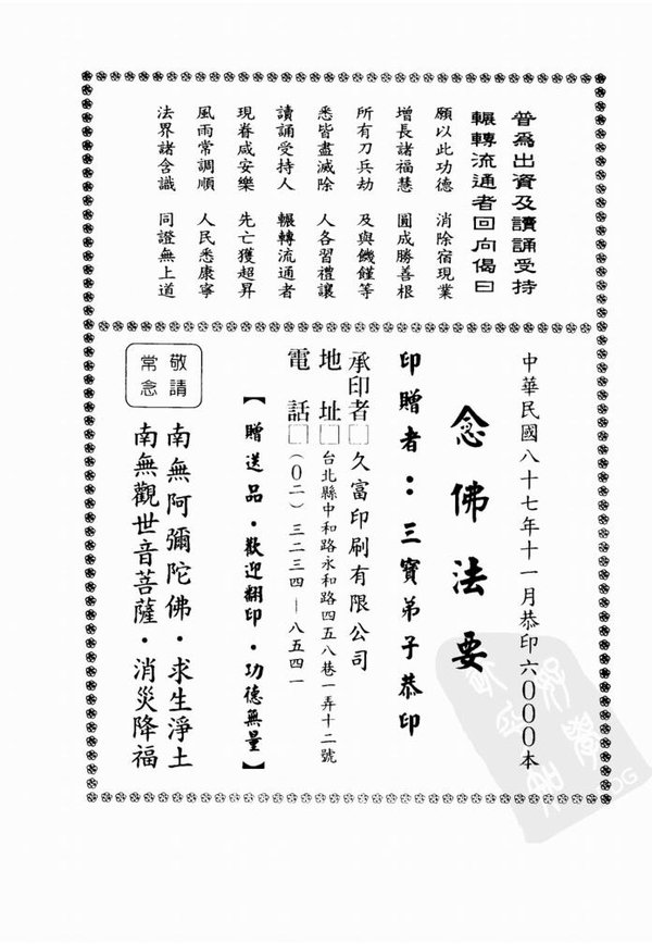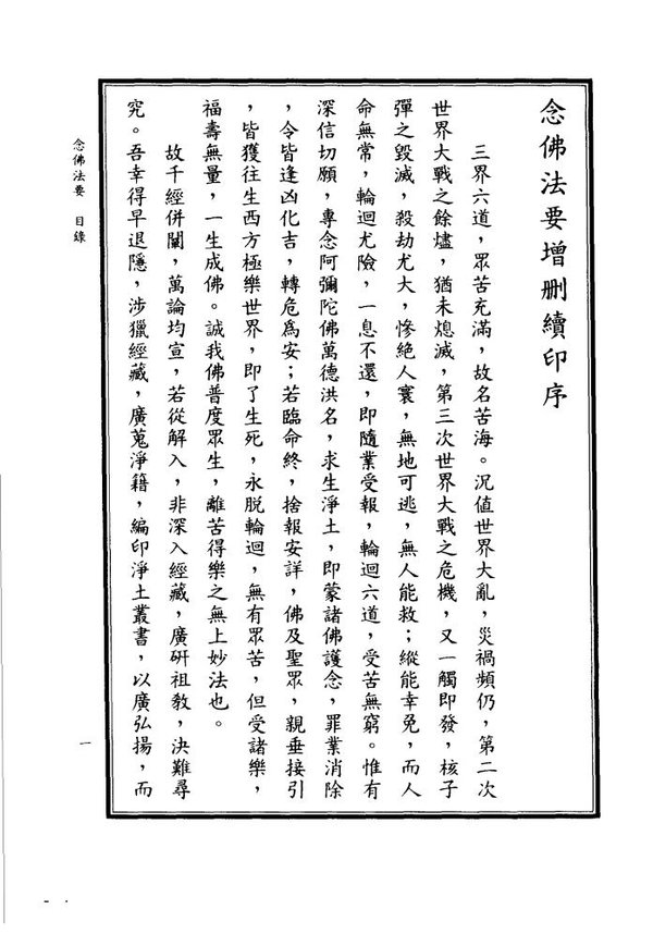 三界六道,众苦充满,故名苦海。况值世界大乱,灾祸频仍,第二次世界大战之余烬,犹未熄灭,第三次世界大战之危机,又一触即发。核子弹之毁灭,杀劫尤大,更惨绝人寰,无地可逃,无人能救,纵能幸免,而人命无常,轮回尤险,一息不还,即随业受报,轮回六道,受苦无穷。唯有深信切愿,专念阿弥陀佛万德洪名,求生净土,即蒙诸佛护念,罪业消除,令皆逢凶化吉,转危为安;若临命终,舍报安详,佛及圣众,亲垂接引,皆获往生西方极乐世界,即了生死,永脱轮回,无有众苦,但受诸乐,福寿无量,一生成佛,诚我佛普度众生,离苦得乐之无上妙法也。