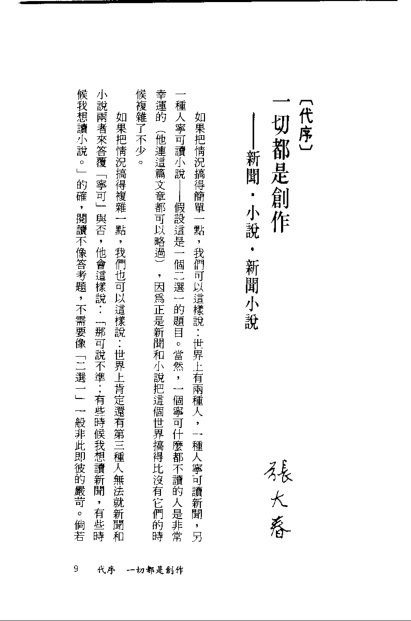 自序   如果把情况搞得简单一点,我们可以这样说:世界上有两种人,一种人宁可读新闻,另一种人宁可读小说--假设这是一个二选一的题目。当然,一个宁可什么都不读的人是非常幸运的(他连这篇文章都可以略过),因为正是新闻和小说把这个世界搞得比没有它们的时候复杂了不少。   如果把情况搞得复杂一点,我们也可以这样说:世界上肯定还有第三种人无法就新闻和小说两者来答覆「宁可」与否,他会这样说:「那可说不準;有些时候我想读新闻,有些时候我想读小说。」的确,阅读不像答考题,不需要像「二选一」一般非此即彼的严苛。倘若我们轻鬆地问,大约有不少的人「宁可」属於第三者。   第一种(宁可读新闻的)人,也许比第二种(宁可读小说的)人「较为关心现实」,不过这也说不一定,有些人在极度关心这个乱七八糟的现实世界之后反而想一头钻进另一个乱七八糟的虚构世界里去--而后者的乱七八糟可能因为不构成对这位读者实际生活的直接威胁而显得有趣得多。   同样的道理,宁可读小说的人也许比宁可读新闻的人「较为欣赏虚构」,不过这也说不一定,有些人在极为欣赏虚构故事的情况之下也许会发现:当天社会新闻版的离奇命案、影剧新闻版的明星緋闻、政治新闻版的国会群殴或国际新闻版的美伊大战要比手边任何一本小说(无论是出自琼或托尔斯泰的笔下)来得好看。 ......