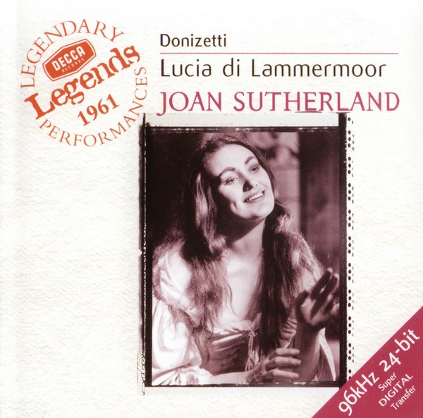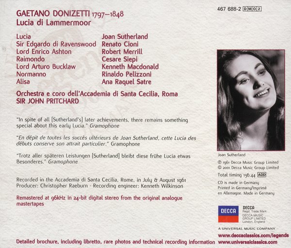 : CD1: 1. Act One, Scene 1 - Preludio 2. Act One, Scene 1 - Tu Sei Turbato! 3. Act One, Scene 1 - Cruda, Funesta Smania 4. Act One, Scene 1 - La Pietade In Suo Favore 5. Act One, Scene 2 - Ancor Non Giunse! 6. Act One, Scene 2 - Regnava Ne Silenzio 7. Act One, Scene 2 - Quando, Rapito In Estasi 8. Act One, Scene 2 - Egli S'avanza 9. Act One, Scene 2 - Sulla Tomba Che Rinserra 10. Act One, Scene 2 - Qui Di Sopsa Eterna...Verranno A Te Sull'aure 11. Act One, Scene 3 - Lucia Fra Poco A Te Verrà 12. Act One, Scene 3 - Appressati, Lucia...Il Pallor, Funesto, Orrendo 13. Act One, Scene 3 - Soffriva Nel Pianto 14. Act One, Scene 3 - Che Fia 15. Act One, Scene 3 - Se Tradirmi Tu Potrai 16. Act One, Scene 3 - Ebben-...Di Tua Speranza 17. Act One, Scene 3 - Ah! Cedi, Cedi, O Piu Scigure 18. Act One, Scene 3 - Al Ben De'tuoi Qual Vittima CD2: 1. Act 1, Scene 4 - Per Te D'immenso Giubilo 2. Act 1, Scene 4 - Dov'e Lucia 3. Act 1, Scene 4 - Chi Mi Frena In Tal Momento 4. Act 1, Scene 4 - T'allontana, Sciagurato 5. Act 2, Scene 1 - Orrida E Questa Notte 6. Act 2, Scene 1 - Qui Del Padre Ancor Respira 7. Act 2, Scene 2 - D'immenso Giubilo 8. Act 2, Scene 2 - Ah! Cessate Quel Contento 9. Act 2, Scene 2 - Oh! Qual Funesto Avvenimento 10. Act 2, Scene 2 - O Giusto Cielo... Il Dolce Suono 11. Act 2, Scene 2 - Ohime! Sorge Il Tremendo Fantasma 12. Act 2, Scene 2 - S'avanza Enrico 13. Act 2, Scene 2 - Spargi D'amaro Pianto 14. Act 2, Scene 2 - Si Tragga Altrove 15. Act 2, Scene 3 - Tombe Delgi Avi Miei 16. Act 2, Scene 3 - Fra Poco A Me Ricovero 17. Act 2, Scene 3 - Oh Meschina! 18. Act 2, Scene 3 - Tu Che A Dio Spiegasti L'ali