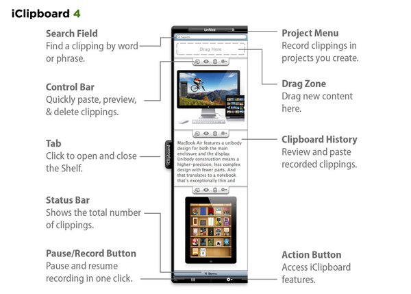 Whenever you press Command-C or choose Edit > Copy in any application, the clipping is automatically recorded in iClipboard's history. iClipboard has a special shelf that unobtrusively slides out from the side of the screen so you can access this clipboard history at any time. This means you're no longer limited to just the last thing copied to the clipboard.