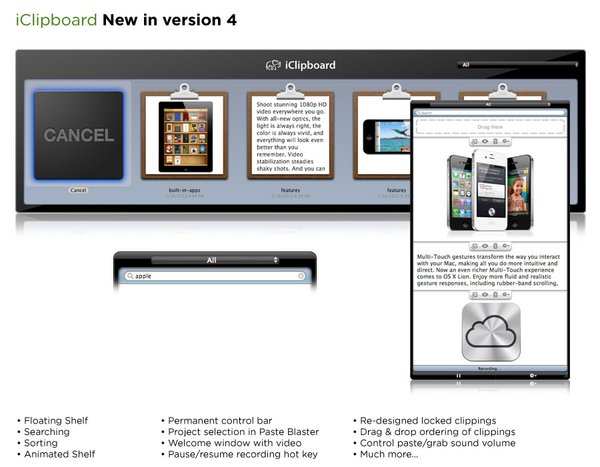 iClipboard自动记录一切你从任何应用程序复制到剪贴板的历史。然后,您可以剪切粘贴这些历史内容,包括五种不同的方法: 1)屏幕的一侧; 2)特殊菜单栏的菜单; 3)快捷热键; 4) “服务”菜单;或5)全新的“粘贴”Blaster“