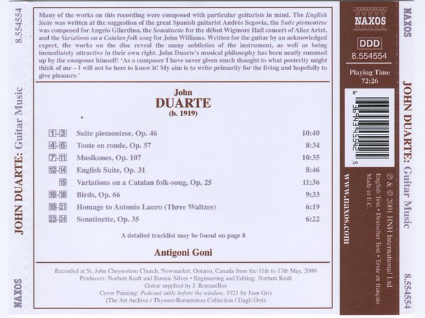Antigoni Goni于1995年在GFA大赛上获得冠军,然后她在北美举办了50场独奏音乐会,并在Naxos公司录制了个人独奏专辑。早在1991年,Antigoni Goni就在Julian Bream大赛中获得第一名,此外还在1995年的Stotsenberg International Comptition,1993年的Artists International Competition和1988在古巴首都哈瓦那举行的International Guitar Competition中获得优胜。Antigoni Goni曾在雅典的国家音乐学院师从于Eangelos Assimakopoulos,在伦敦的皇家音乐学院师从与John Mills和Julian Bream,后来又在纽约的Juiliard音乐学校向Sharon Isbin学习。作为一名独奏演奏家,Antigoni Goni曾经在莫斯科、圣彼得堡、欧洲和北美地区进行演奏。她现在是Juilliard音乐学校预科部吉他系的主任。