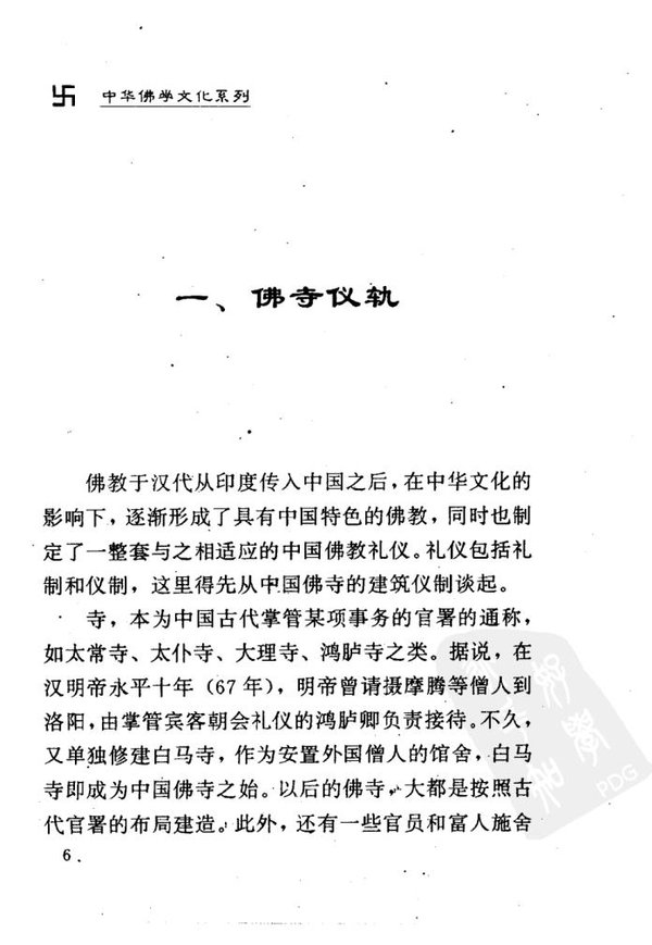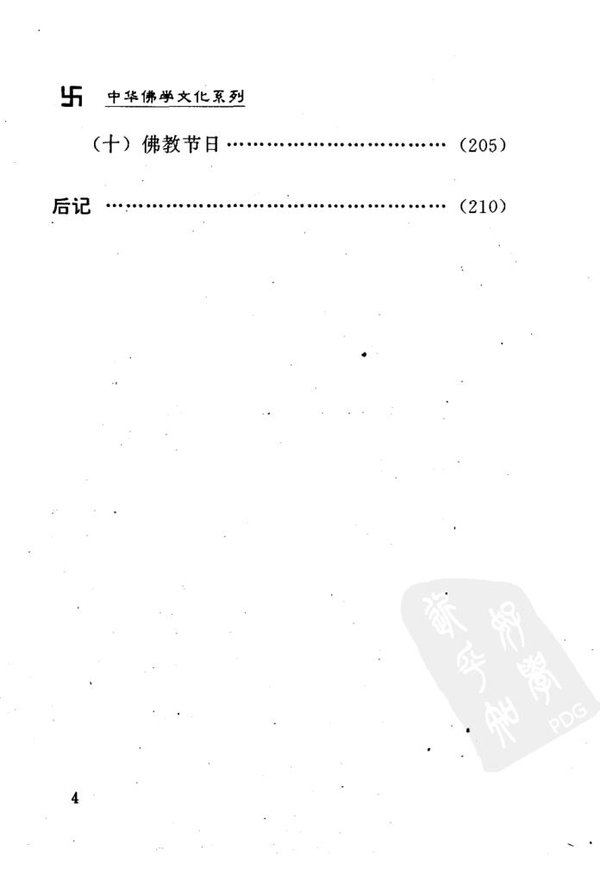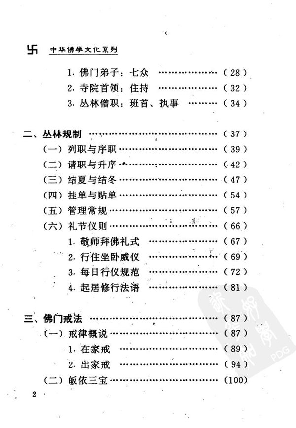 : 引言 晨钟暮鼓话礼仪 (一)殿堂及其佛像 1. 山门殿 2. 天王殿 3. 大雄殿 4. 藏经楼 5. 中轴线上其它殿堂 6. 罗汉堂 7. 中轴线侧其它殿堂 8. 佛塔与僧塔 (二)丛林及其设置 1. 禅堂 2. 客堂 3. 库房 4. 大寮 5. 衣钵寮 (三)僧团及共组成 1. 佛门北子:七众 2. 寺院首领:住持 3. 丛林僧职:班首、执事 二、丛林规制 (一)列职与序职 (二)请职与升序 (三)结夏与结冬 (四)挂单与贴单 (五)传法与升座 (六)管理常规 (七)礼节仪则 三、佛门戒法 (一)戒律概说 (二)皈依三宝 (三)受持五戒 (四)剃度出家 (五)三坛传戒 四、佛教用品 (一)僧服 (二)法物 (三)呗器 五、佛事法会 (一)转咒 (二)念普佛 (三)放生 (四)放焰口 (五)斋天 (六)慈非忆忏 (七)水陆法会 (八)浴佛法会 (九)盂兰盆会 (十)佛教节日 后记