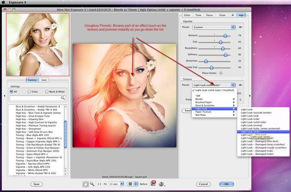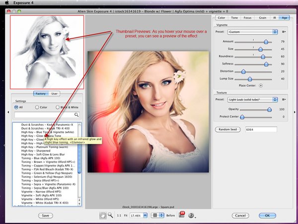 Enjoy all the creative tools of film photography, such as discontinued films, dark room tricks, and lo-fi camera quirks. We accurately simulate classic films, like Kodachrome, Polaroid, and Panatomic-X. The result is a photo that looks like it was made by a human, not a computer. There is careful research under the hood, but we keep the controls simple so you can focus on your art. Exposure 4 has a completely redesigned user interface that helps you quickly develop your own look. Across the board everything is faster and much easier to use. See our features page for all the new improvements. What's New Improved User Interface A redesigned user interface makes Exposure 4 much easier to use. Everything is faster and more interactive. Unified Filters. Black and White and Color filters are combined so you can find all the effects in one place. Group presets let you explore custom effects easily. Thumbnail Preview. Hover over a setting to preview it in the thumbnail. Fast text search. Find settings based on name or description. New Controls and Effects New controls let you create custom looks quickly and intuitively. Texture Effects (light leaks, dust and scratches, borders) New controls let you create Black and White effects more easily (more color channels, B/W Color Filter, Split Toning Control). New controls let you create custom color effects more easily (more saturation channels, color split toning). Color infrared film provides psychedelic color shifts. New Presets Many presets have been improved and new ones added. Visit our examples page for a sampling of some of the hundreds of presets. New textures help you recreate historical photographic processes like Cyanotype, Lith printing and Wet Plate Photography. Lo-Fi toy camera presets are now more realistic using light leaks and organic textures. What’s Already Great Realistic Grain Exposure’s grain is carefully researched and realistic, unlike the digital speckles rendered by other software. Like actual grain, it clumps and is strongest in the midtones. Grain size scales with your image size, just like real photographic enlargement. Non-Destructive Editing Exposure supports a non-destructive workflow, making experimentation easy. Effects in Photoshop are rendered on a new layer, leaving your original image untouched. In Photoshop, Exposure can be run as a Smart Filter for easy tweaking of the effect after it is created. Batch processing is supported with actions in Photoshop and through tight integration in Lightroom. Multithreaded Exposure takes advantage of multiple processors and multiple cores in order to run fast on modern computers. The more cores, the faster Exposure runs. Huge Range of Effects The best way to see what Exposure can do is to check out our examples, videos, and try it yourself for free. For a quick overview, here are some of the techniques of film photography that Exposure handles. These are just the tip of the iceberg. Black & White Films Agfa APX Agfa Scala Fuji Neopan Ilford Delta Ilford HP5 Kodak PLUS-X Kodak Panatomic-X Kodak T-MAX Kodak TRI-X Kodak Technical Pan Color Print Films Fuji Pro C, S, and H Fuji Reala Kodak Portra NC Kodak Portra VC Kodak Ultra Color UC Color Slide Films Agfa RSX II Agfachrome Fuji Astia Fuji Provia Fuji Velvia GAF Ektachrome EES, G, GX, and VX Other Effects Kodachrome, every variation from 1936 to the present day Polaroid, including Polapan and Polachrome Technicolor Infrared Early photographic processes, including Autochrome, Calotype, and Daguerreotype Color toning for B&W photos, many variations including split toning Blur caused by plastic lenses “Glamour Shots” soft focus Vignette, wide range of shapes Dust & Scratches Cross processing, many variations Wide range of Lo-Fi presets to simulate cheap plastic cameras Wide range of fading and aging effects Bleach Bypass