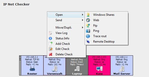 IP Net Checker is a network monitoring software allows you to verify the network connectivity of IP hosts on the Internet and LAN. The program periodically pings, checks TCP ports or HTTP on user specified computers (workstations, servers) or other network devices (routers). It is able to check IP and show notifications when the status change. You can also view and access shared folders, open web and ftp, ping, trace rout and sending messages. IP Net Checker can generate status log files.