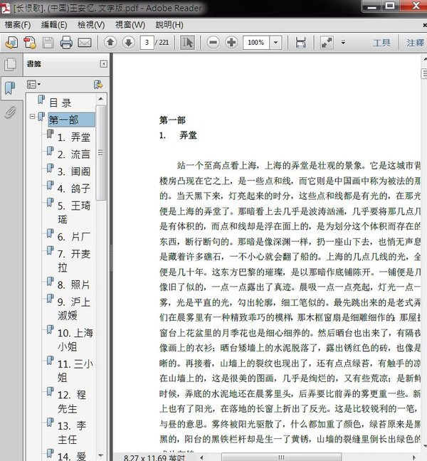 : 第一部 1. 弄堂 2. 流言 3. 闺阁 4. 鸽子 5. 王琦瑶 6. 片厂 7. 开麦拉 8. 照片 9. 沪上淑媛 10. 上海小姐 11. 三小姐 12. 程先生 13. 李主任 14. 艾丽斯公寓 15. 艾丽斯的告别 第二部 1. 邬桥 2. 外婆 3. 阿二 4. 阿二的心 5. 上海 6. 平安里 7. 熟客 8. 牌友 9. 下午茶 10. 围炉夜话 11. 康明逊 12. 萨沙 13. 还有一个程先生 14. 分娩 15. 昔人已乘黄鹤去 16. 此地空余黄鹤楼 第三部 1. 薇薇 2. 薇薇的时代 3. 薇薇的女朋友 4. 薇薇的男朋友 5. 舞会 6. 旅游 7. 圣诞节 8. 婚礼 9. 去美国 10. 老克腊 11. 长脚 12. 祸起萧墙 13. 碧落黄泉