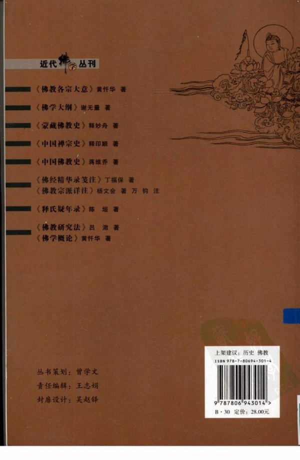 晚清民国初年以来,中国学术思想界风气大开,西学盛行,国学复兴。佛教学术研究一度成为热门的研究课题,佛教学术团体和研究机构纷纷成立,佛学报刊陆续出版发行,各地新兴刻经处刻印大量藏经典籍,僧俗学者如杨文会、黄忏会等潜心佛学研究,在佛教历史、经典等诸多方面,均有丰富的著作问世、《近代佛学丛刊》所选著作,内容涵盖佛教通史、专门史、佛学总论、宗派概述、佛经译释、人物传记诸领域,作者均为一时名家。列入首辑书目的有蒋维乔《中国佛教史》、释印顺《中国禅宗史》、释妙舟《蒙藏佛教史》、谢无量《佛学大纲》、黄忏华《佛学概论》、吕潋《佛教研究法》、杨文会《佛教宗派详注》、黄忏华《佛教各宗大意》、丁福保《佛经精华录笺注》和陈垣《释氏疑年录》等。