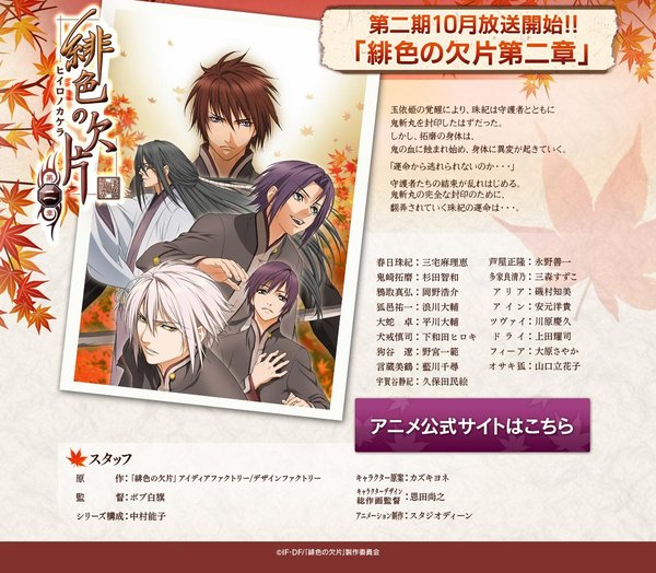 今年4月播出的TV动画「绯色的欠片」,改编自IDEA FACTORY(Otomate)于06年发售的同名乙女向恋爱冒险游戏。故事主要讲述了体内流有玉依姬血脉的主人公春日珠纪,身为玉依姬的她继承着封印 鬼斩丸的使命,而鬼斩丸是由于某种原因开始苏醒并在村子中集结异形的刀。在接受着命运安排的同时,珠纪的身边出现了一群被称为“守护者”的守护玉依姬的少 年们,就这样玉依姬与守护者们的奇谭正式拉开了帷幕……本作的故事情节以浓重的日本和风为基础,还加入了西洋元素,使得整部作品更加有特色。    早在动画尚未开播时,在ytv的英文网站上就曾注明本作将会有26话,而BD/DVD总共只有7卷13话,这使人推测本作极有可能分割两季播放。如今 果然如此,在动画第一季的最终话还未播放之时,官方推特上就已发表了第二季决定的好消息。而在最终话完结后的第二季预告中我们还可以了解到一些关键内容, 画面上的“冲击的第二章”,以及“觉醒”等字眼的出现,还有女主角珠妃的特写,这些都预示着第二季的剧情发展与看点。目前已确定「绯色的欠片 第二章」将于10月开始播放,有爱的粉丝可要拭目以待了。 【首播情报】 TOKYO MX・2012年9月30日(星期日) 22:00 异域动漫官方微博 新浪微博: http://weibo.com/u/1620955197 腾讯微博: http://t.qq.com/yydm_doacg 搜狐微博: http://t.sohu.com/u/331182493 网易微博: http://t.163.com/yydm 异域字幕组 http://www.yydm.com 招募后期特效压制人员 q43295846 FansQQ②群 126818613