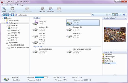 Comfy File Recovery recovers any accidentally deleted files: documents, digital images, compressed archives, music, and video. The program lets you recover information that was lost after formatting logical volumes on hard drives, removable drives, USB flash drives and memory cards controlled by NTFS or FAT file systems. A user-friendly interface lets you find and recover deleted files in just a few minutes.