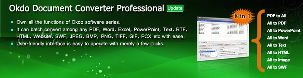 Now Okdo Document Converter Professional is the most advanced converter. Own the most powerful conversion function. you can batch convert among any document, image, PDF, website etc with ease. The program can convert with high output quality and very fast speed. It is a standalone program which does not need Adobe Acrobat software support. Own all the functions of Okdo Sofware series.