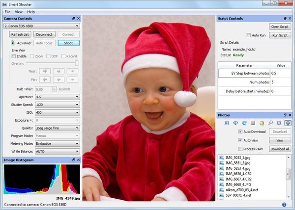 Smart Shooter allows you to fully control your camera from your computer, giving you freedom to explore and experiment to help take the perfect picture. Automatic download and display means you can fully evaluate your photos in seconds, and real time live view output will help you focus and compose the scene. Scripting language lets you control your camera, allowing you to take multiple photos with varying settings just by clicking a single button.