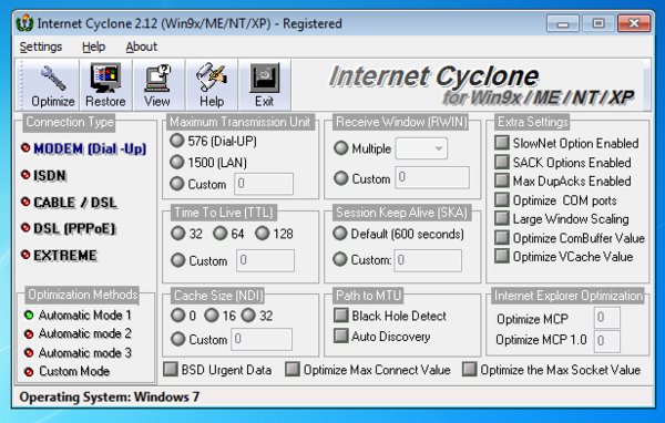 Internet Cyclone is designed to automatically change many registry settings in Windows such as: Maximum Transmission Unit (MTU), Maximum Segment Size (MSS), Time To Live (TTL), TCP Receive Window (Rwin), Cache Size (NDI), PMTU Black Hole Detect, PMTU Auto Discovery (PAD), Session Keep Alive (SKA) and some Windows Extra settings like: Selective Acknowledgement (SACK), Maximum Duplicate Acknowledge (Max DupAcks), Large Window Scaling, Ports COM, VCache value, Combuffer value, Internet Explorer settings, Maximum connection per server and many other values in order to increase internet speed.