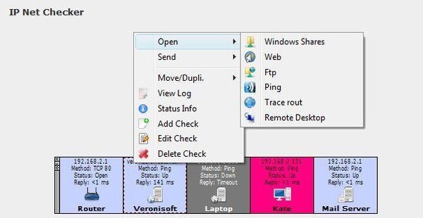 IP Net Checker is a network monitoring software allows you to verify the network connectivity of IP hosts on the Internet and LAN. The program periodically pings, checks TCP ports or HTTP on user specified computers (workstations, servers) or other network devices (routers). It is able to check IP and show notifications when the status change. You can also view and access shared folders, open web and ftp, ping, trace rout and sending messages. IP Net Checker can generate status log files.
