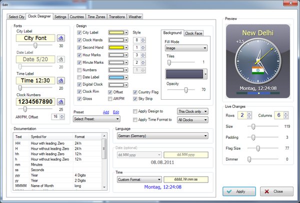 Choose different Fonts and Font Sizes for city labels, digital clock and the numbers on the analog clock faces