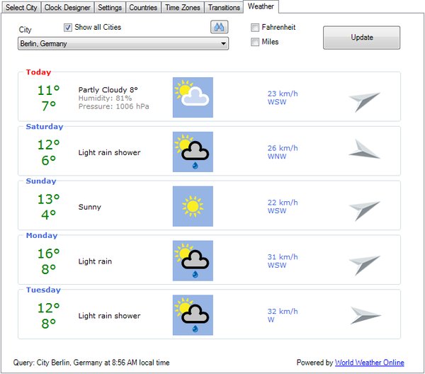 Weather Report for the current day and the next four days, for every included city - with animated weather icons