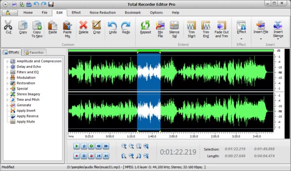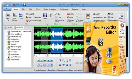 Total Recorder Editor Pro is your complete audio solution to perfectly edit, cut, copy, paste, and master all of your recordings in detail. It allows you to perform various operations with audio data such as displaying a waveform of an audio file, filtering, applying various audio effects and more. It includes a click and crackle filter for cleaning vinyl records, a noise filter for cassette-tape recordings, and an equalizer to enhance the sound quality of all recordings.