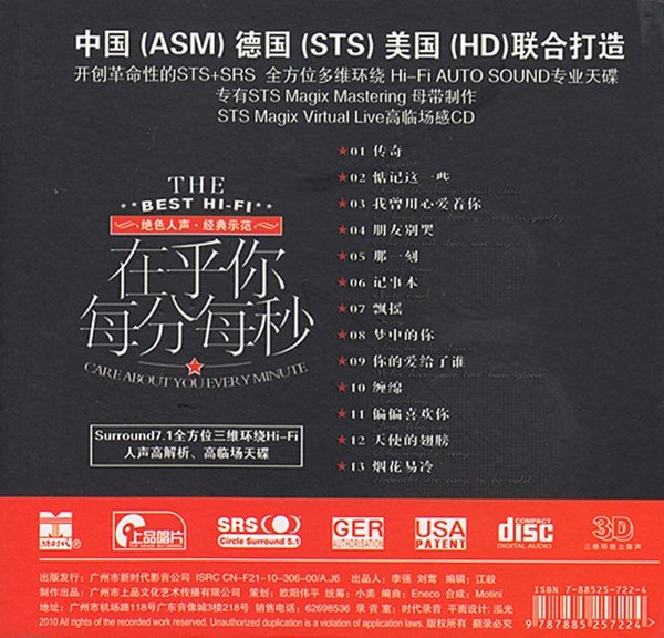 《在乎你每分每秒》不是每一首歌曲背后有故事,但或许每一首歌都有听着为之泪流,昨日的传唱,成就了今天的经典,昨日的情感,成为了今天的思绪!如果你懂,一切尽在音乐中,经典歌曲总是给我们一首一首的好歌,爱的苦涩酸甜在款款轻唱中是那么的感人至深,也许这让我们有了点思考,体味动人的音乐,也许影响和改变了一生!只有专业的,才是值得信赖的,矢志不渝,追求完美HIFI的极品靓声天碟!